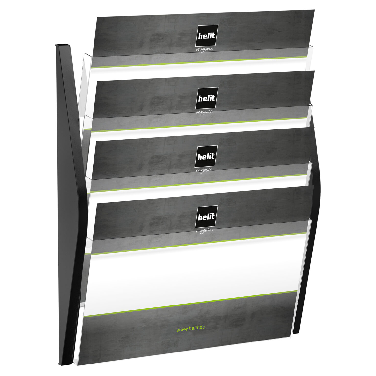 Das Wandbogendisplay „the arc“ für das Format 4 x DIN A3 (quer) besteht aus deckenden oder transluzenten Seitenteilen und glasklaren Taschen aus PS. Die Taschen werden von oben bestückt. Dieses Produkt wird vollständig montiert geliefert. Dieser Prospekthalter eignet sich ideal für Rezeptionen, Wartezimmer und für vieles mehr.